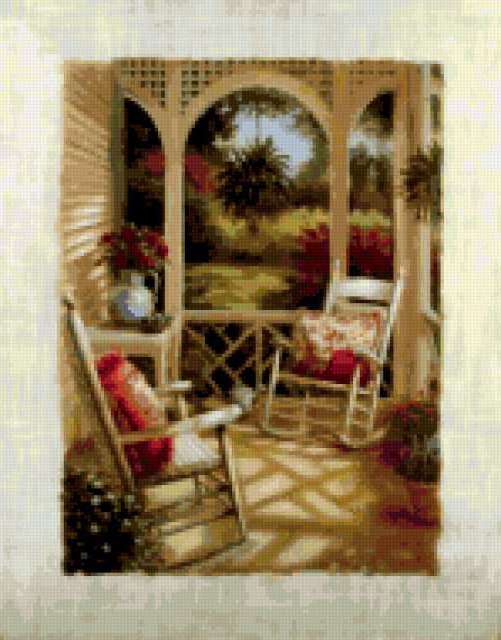 Ориентировочно так, схема вышивки «&6120», созданная автором Axlamonka, будет выглядеть при отшиве на канве. Размер данной вышивки равен 149x190 крестов, при этом используется 72 цветов. Ключевые слова, по которым можно найти эту схему: пейзаж, веранда, цветы, кресла. Также, вы можете взглянуть на оригинальную картинку, соответствующую данной схеме вышивки.