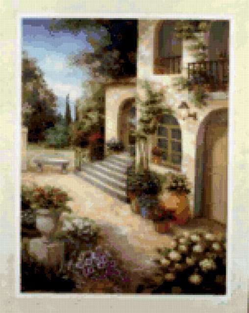 Ориентировочно так, схема вышивки «&6121», созданная автором Axlamonka, будет выглядеть при отшиве на канве. Размер данной вышивки равен 151x190 крестов, при этом используется 83 цветов. Ключевые слова, по которым можно найти эту схему: пейзаж, двор, цветы, зелень, ступеньки, клумба. Также, вы можете взглянуть на оригинальную картинку, соответствующую данной схеме вышивки.