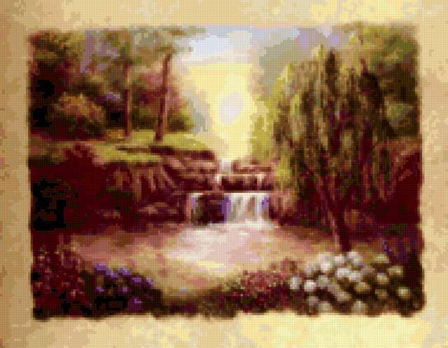 Ориентировочно так, схема вышивки «&6122», созданная автором Axlamonka, будет выглядеть при отшиве на канве. Размер данной вышивки равен 190x148 крестов, при этом используется 71 цветов. Ключевые слова, по которым можно найти эту схему: пейзаж, парк, водопад. Также, вы можете взглянуть на оригинальную картинку, соответствующую данной схеме вышивки.