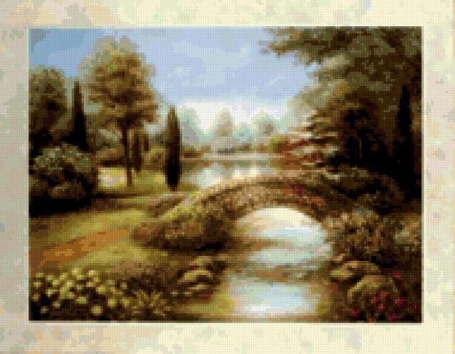 Ориентировочно так, схема вышивки «&6128», созданная автором Axlamonka, будет выглядеть при отшиве на канве. Размер данной вышивки равен 190x148 крестов, при этом используется 70 цветов. Ключевые слова, по которым можно найти эту схему: пейзаж, парк, цветы, мостик, река. Также, вы можете взглянуть на оригинальную картинку, соответствующую данной схеме вышивки.