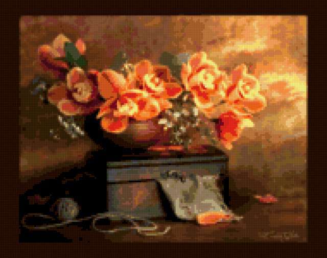 Ориентировочно так, схема вышивки «&6133», созданная автором Axlamonka, будет выглядеть при отшиве на канве. Размер данной вышивки равен 190x150 крестов, при этом используется 65 цветов. Ключевые слова, по которым можно найти эту схему: цветок, орхидея, натюрморт. Также, вы можете взглянуть на оригинальную картинку, соответствующую данной схеме вышивки.