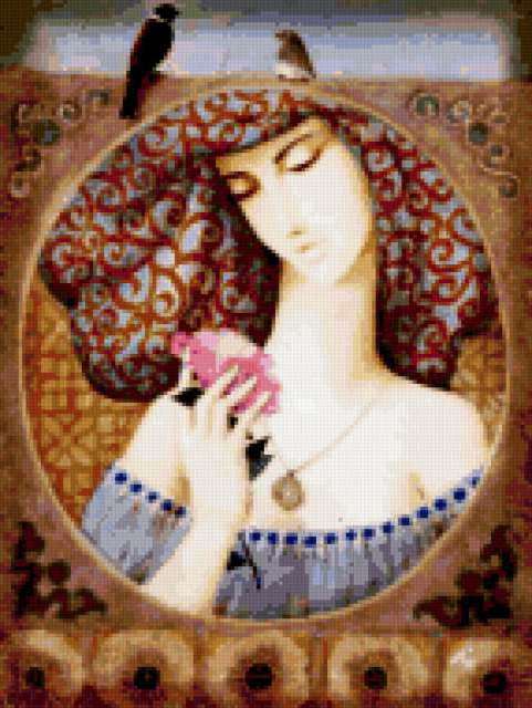 Ориентировочно так, схема вышивки «&6153», созданная автором Axlamonka, будет выглядеть при отшиве на канве. Размер данной вышивки равен 143x190 крестов, при этом используется 79 цветов. Ключевые слова, по которым можно найти эту схему: леди. Также, вы можете взглянуть на оригинальную картинку, соответствующую данной схеме вышивки.