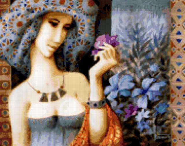 Ориентировочно так, схема вышивки «&6154», созданная автором Axlamonka, будет выглядеть при отшиве на канве. Размер данной вышивки равен 190x150 крестов, при этом используется 85 цветов. Ключевые слова, по которым можно найти эту схему: леди. Также, вы можете взглянуть на оригинальную картинку, соответствующую данной схеме вышивки.