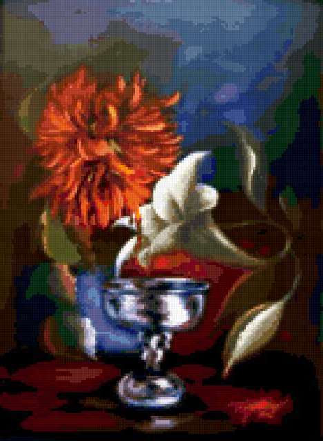 Ориентировочно так, схема вышивки «&6156», созданная автором Axlamonka, будет выглядеть при отшиве на канве. Размер данной вышивки равен 139x190 крестов, при этом используется 70 цветов. Ключевые слова, по которым можно найти эту схему: цветы, натюрморт, лилия, георгин. Также, вы можете взглянуть на оригинальную картинку, соответствующую данной схеме вышивки.