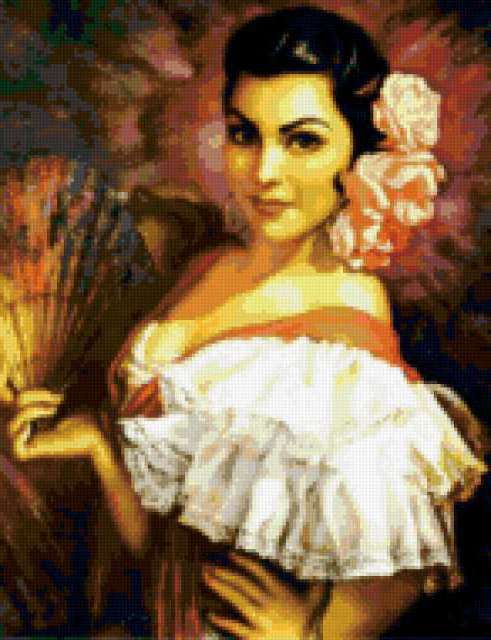 Ориентировочно так, схема вышивки «&6166», созданная автором Axlamonka, будет выглядеть при отшиве на канве. Размер данной вышивки равен 146x190 крестов, при этом используется 71 цветов. Ключевые слова, по которым можно найти эту схему: девушка, красотка, восток. Также, вы можете взглянуть на оригинальную картинку, соответствующую данной схеме вышивки.