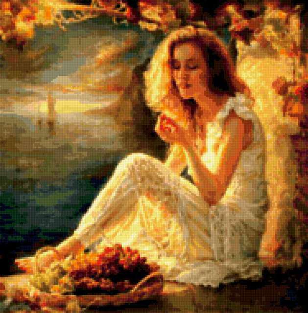 Ориентировочно так, схема вышивки «&6168», созданная автором Axlamonka, будет выглядеть при отшиве на канве. Размер данной вышивки равен 187x190 крестов, при этом используется 79 цветов. Ключевые слова, по которым можно найти эту схему: девушка, красотка, осень. Также, вы можете взглянуть на оригинальную картинку, соответствующую данной схеме вышивки.