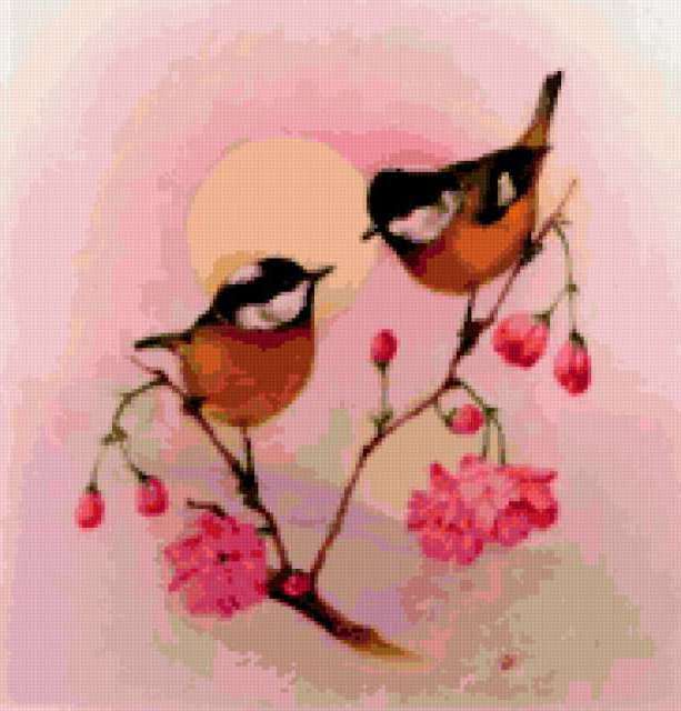 Ориентировочно так, схема вышивки «&6173», созданная автором Axlamonka, будет выглядеть при отшиве на канве. Размер данной вышивки равен 182x190 крестов, при этом используется 68 цветов. Ключевые слова, по которым можно найти эту схему: птички, весна, цветение. Также, вы можете взглянуть на оригинальную картинку, соответствующую данной схеме вышивки.