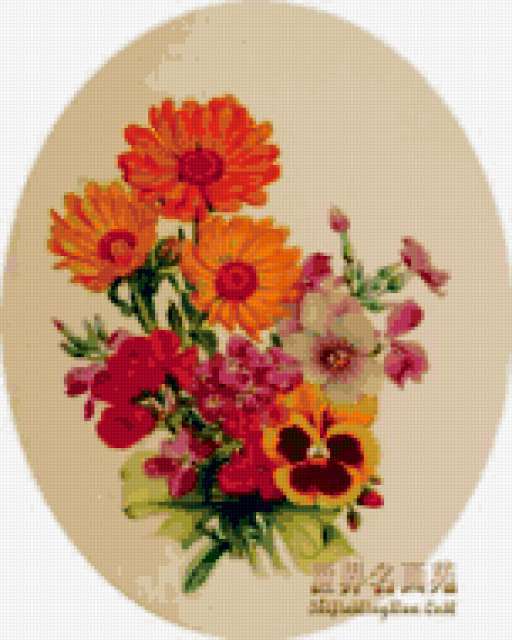 Ориентировочно так, схема вышивки «&6176», созданная автором Axlamonka, будет выглядеть при отшиве на канве. Размер данной вышивки равен 152x190 крестов, при этом используется 68 цветов. Ключевые слова, по которым можно найти эту схему: цветы, букет, картина. Также, вы можете взглянуть на оригинальную картинку, соответствующую данной схеме вышивки.