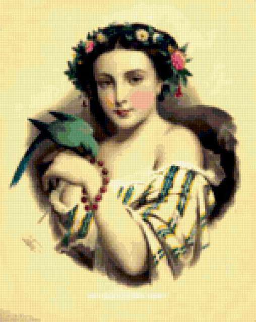 Ориентировочно так, схема вышивки «&6194», созданная автором Axlamonka, будет выглядеть при отшиве на канве. Размер данной вышивки равен 151x190 крестов, при этом используется 68 цветов. Ключевые слова, по которым можно найти эту схему: девушка, красотка, пташка, веночек. Также, вы можете взглянуть на оригинальную картинку, соответствующую данной схеме вышивки.