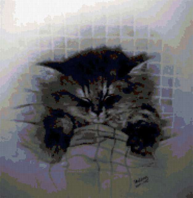 Ориентировочно так, схема вышивки «&6196», созданная автором Axlamonka, будет выглядеть при отшиве на канве. Размер данной вышивки равен 186x190 крестов, при этом используется 28 цветов. Ключевые слова, по которым можно найти эту схему: котенок, лапуля, подушка. Также, вы можете взглянуть на оригинальную картинку, соответствующую данной схеме вышивки.