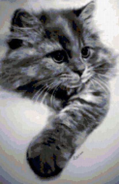 Ориентировочно так, схема вышивки «&6206», созданная автором Axlamonka, будет выглядеть при отшиве на канве. Размер данной вышивки равен 123x190 крестов, при этом используется 28 цветов. Ключевые слова, по которым можно найти эту схему: котенок, лапуля. Также, вы можете взглянуть на оригинальную картинку, соответствующую данной схеме вышивки.