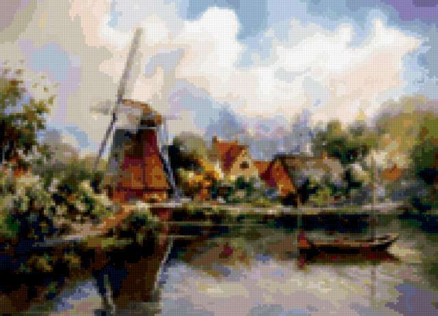 Ориентировочно так, схема вышивки «&6207», созданная автором Axlamonka, будет выглядеть при отшиве на канве. Размер данной вышивки равен 190x137 крестов, при этом используется 81 цветов. Ключевые слова, по которым можно найти эту схему: пейзаж. деревушка, река, мельница, лодка. Также, вы можете взглянуть на оригинальную картинку, соответствующую данной схеме вышивки.