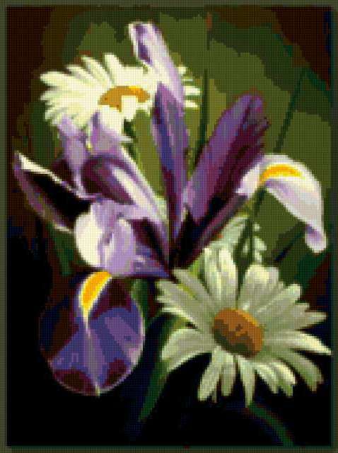 Ориентировочно так, схема вышивки «&6227», созданная автором Axlamonka, будет выглядеть при отшиве на канве. Размер данной вышивки равен 142x190 крестов, при этом используется 57 цветов. Ключевые слова, по которым можно найти эту схему: цветы, ирис, ромашки. Также, вы можете взглянуть на оригинальную картинку, соответствующую данной схеме вышивки.