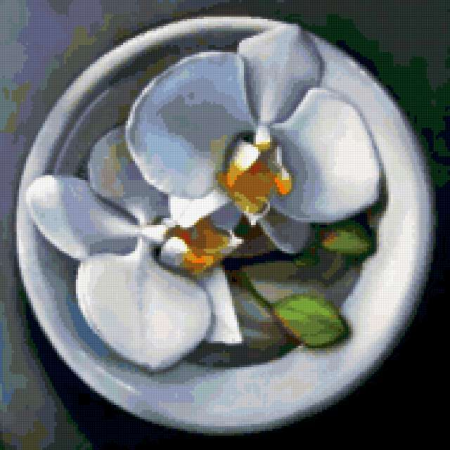Ориентировочно так, схема вышивки «&6239», созданная автором Axlamonka, будет выглядеть при отшиве на канве. Размер данной вышивки равен 190x190 крестов, при этом используется 70 цветов. Ключевые слова, по которым можно найти эту схему: цветок, орхидея, натюрморт, подушка. Также, вы можете взглянуть на оригинальную картинку, соответствующую данной схеме вышивки.