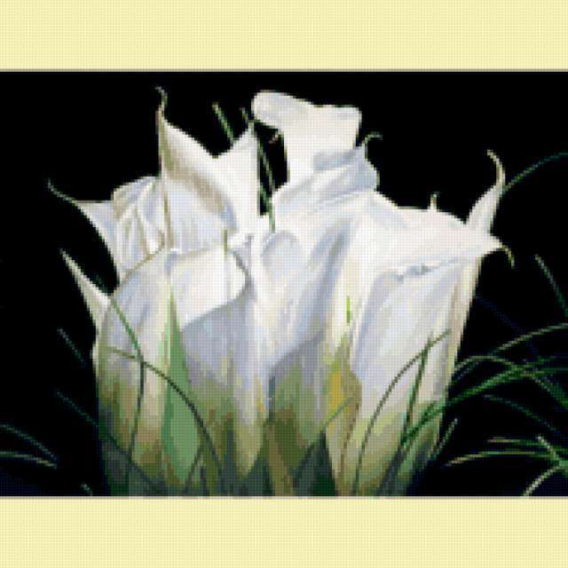Ориентировочно так, схема вышивки «&6242», созданная автором Axlamonka, будет выглядеть при отшиве на канве. Размер данной вышивки равен 190x190 крестов, при этом используется 67 цветов. Ключевые слова, по которым можно найти эту схему: цветы, каллы. Также, вы можете взглянуть на оригинальную картинку, соответствующую данной схеме вышивки.