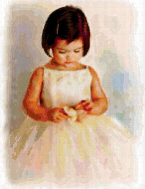 Ориентировочно так, схема вышивки «&6256», созданная автором Axlamonka, будет выглядеть при отшиве на канве. Размер данной вышивки равен 146x190 крестов, при этом используется 70 цветов. Ключевые слова, по которым можно найти эту схему: девочка, ребенок, прелесть. Также, вы можете взглянуть на оригинальную картинку, соответствующую данной схеме вышивки.
