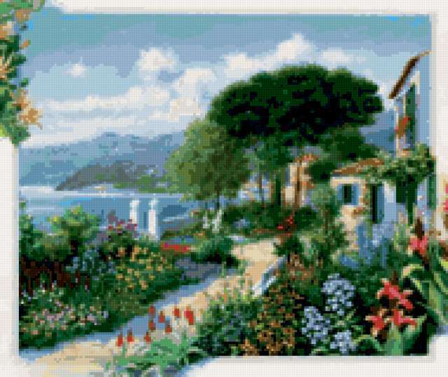 Ориентировочно так, схема вышивки «&6259», созданная автором Axlamonka, будет выглядеть при отшиве на канве. Размер данной вышивки равен 190x160 крестов, при этом используется 59 цветов. Ключевые слова, по которым можно найти эту схему: пейзаж, море, горы, набережная, цветы, дорожка. Также, вы можете взглянуть на оригинальную картинку, соответствующую данной схеме вышивки.