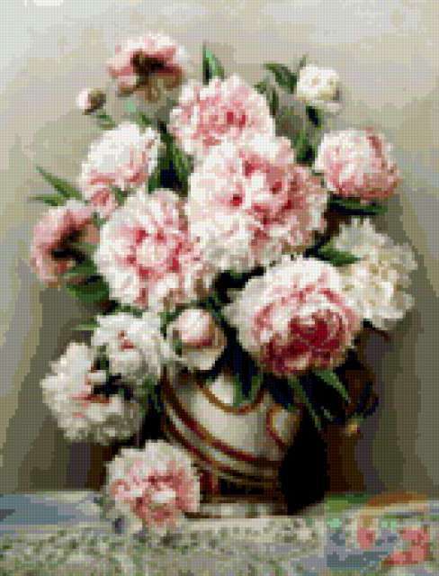Ориентировочно так, схема вышивки «&6274», созданная автором Axlamonka, будет выглядеть при отшиве на канве. Размер данной вышивки равен 145x190 крестов, при этом используется 66 цветов. Ключевые слова, по которым можно найти эту схему: цветы, натюрморт, пионы, картина. Также, вы можете взглянуть на оригинальную картинку, соответствующую данной схеме вышивки.