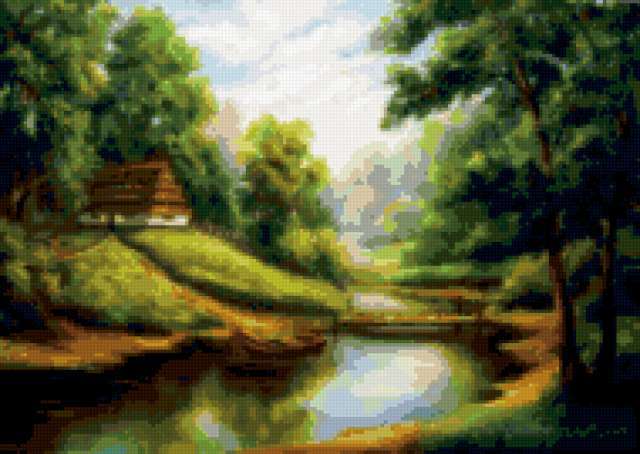 Ориентировочно так, схема вышивки «&6281», созданная автором Axlamonka, будет выглядеть при отшиве на канве. Размер данной вышивки равен 190x135 крестов, при этом используется 63 цветов. Ключевые слова, по которым можно найти эту схему: пейзаж, домик, река, лес. Также, вы можете взглянуть на оригинальную картинку, соответствующую данной схеме вышивки.