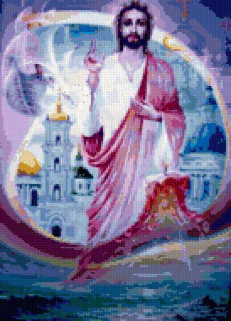 Ориентировочно так, схема вышивки «&6294», созданная автором Axlamonka, будет выглядеть при отшиве на канве. Размер данной вышивки равен 137x190 крестов, при этом используется 67 цветов. Ключевые слова, по которым можно найти эту схему: картина, иисус, храм. Также, вы можете взглянуть на оригинальную картинку, соответствующую данной схеме вышивки.