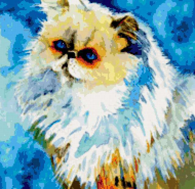 Ориентировочно так, схема вышивки «&6297», созданная автором Axlamonka, будет выглядеть при отшиве на канве. Размер данной вышивки равен 190x185 крестов, при этом используется 63 цветов. Ключевые слова, по которым можно найти эту схему: киска, пушистик, подушка. Также, вы можете взглянуть на оригинальную картинку, соответствующую данной схеме вышивки.