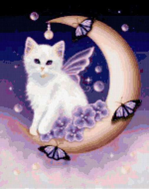 Ориентировочно так, схема вышивки «&6298», созданная автором Axlamonka, будет выглядеть при отшиве на канве. Размер данной вышивки равен 150x190 крестов, при этом используется 47 цветов. Ключевые слова, по которым можно найти эту схему: киска, луна, цветы, бабочки. Также, вы можете взглянуть на оригинальную картинку, соответствующую данной схеме вышивки.