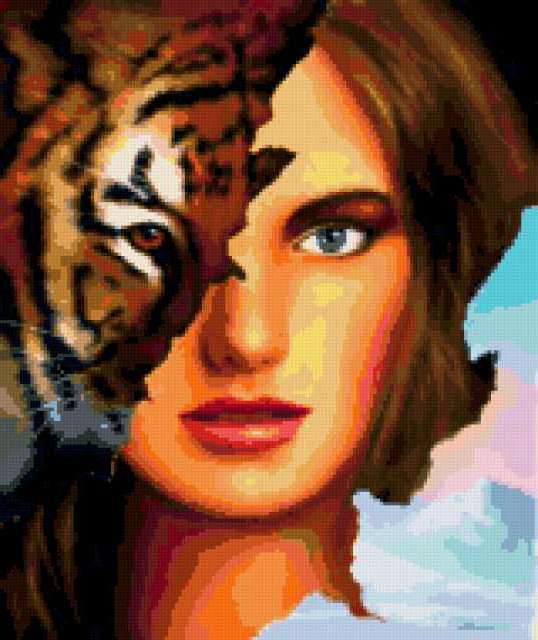 Ориентировочно так, схема вышивки «&6303», созданная автором Axlamonka, будет выглядеть при отшиве на канве. Размер данной вышивки равен 160x190 крестов, при этом используется 56 цветов. Ключевые слова, по которым можно найти эту схему: девушка, тигр. Также, вы можете взглянуть на оригинальную картинку, соответствующую данной схеме вышивки.