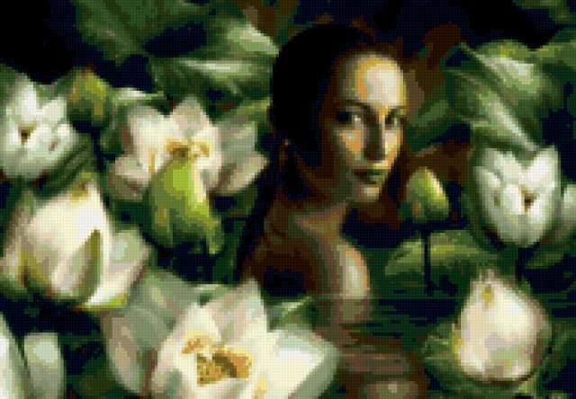 Ориентировочно так, схема вышивки «&6309», созданная автором Axlamonka, будет выглядеть при отшиве на канве. Размер данной вышивки равен 190x132 крестов, при этом используется 50 цветов. Ключевые слова, по которым можно найти эту схему: цветы, лилии, девушка, озеро. Также, вы можете взглянуть на оригинальную картинку, соответствующую данной схеме вышивки.