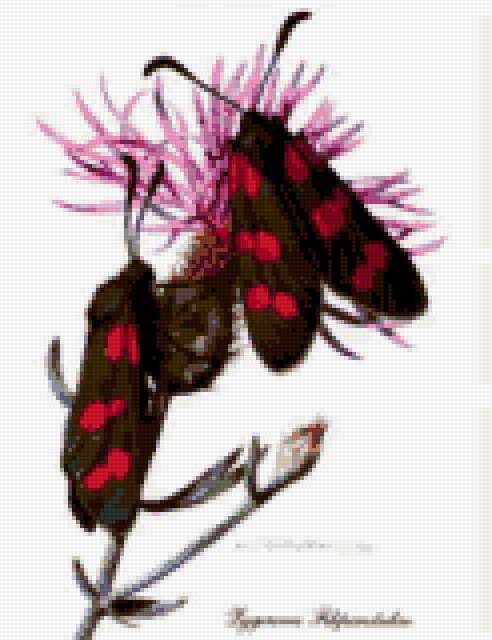 Ориентировочно так, схема вышивки «&6335», созданная автором Axlamonka, будет выглядеть при отшиве на канве. Размер данной вышивки равен 123x160 крестов, при этом используется 40 цветов. Ключевые слова, по которым можно найти эту схему: бабочки, чертополох. Также, вы можете взглянуть на оригинальную картинку, соответствующую данной схеме вышивки.