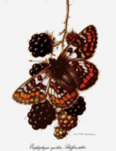 Ориентировочно так, схема вышивки «&6338», созданная автором Axlamonka, будет выглядеть при отшиве на канве. Размер данной вышивки равен 123x160 крестов, при этом используется 49 цветов. Ключевые слова, по которым можно найти эту схему: бабочка, ежевика, ягоды. Также, вы можете взглянуть на оригинальную картинку, соответствующую данной схеме вышивки.
