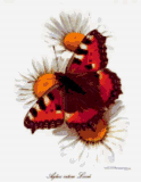 Ориентировочно так, схема вышивки «&6339», созданная автором Axlamonka, будет выглядеть при отшиве на канве. Размер данной вышивки равен 124x160 крестов, при этом используется 39 цветов. Ключевые слова, по которым можно найти эту схему: бабочка, цветы, ромашки. Также, вы можете взглянуть на оригинальную картинку, соответствующую данной схеме вышивки.