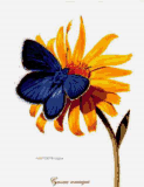 Ориентировочно так, схема вышивки «&6343», созданная автором Axlamonka, будет выглядеть при отшиве на канве. Размер данной вышивки равен 123x160 крестов, при этом используется 39 цветов. Ключевые слова, по которым можно найти эту схему: бабочка, цветок. Также, вы можете взглянуть на оригинальную картинку, соответствующую данной схеме вышивки.