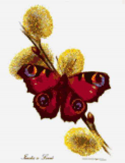 Ориентировочно так, схема вышивки «&6351», созданная автором Axlamonka, будет выглядеть при отшиве на канве. Размер данной вышивки равен 123x160 крестов, при этом используется 49 цветов. Ключевые слова, по которым можно найти эту схему: бабочк, веточка, верба. Также, вы можете взглянуть на оригинальную картинку, соответствующую данной схеме вышивки.