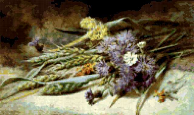 Ориентировочно так, схема вышивки «&6356», созданная автором Axlamonka, будет выглядеть при отшиве на канве. Размер данной вышивки равен 190x113 крестов, при этом используется 61 цветов. Ключевые слова, по которым можно найти эту схему: букет, натюрморт, колоски, васильки, цветы. картина. Также, вы можете взглянуть на оригинальную картинку, соответствующую данной схеме вышивки.