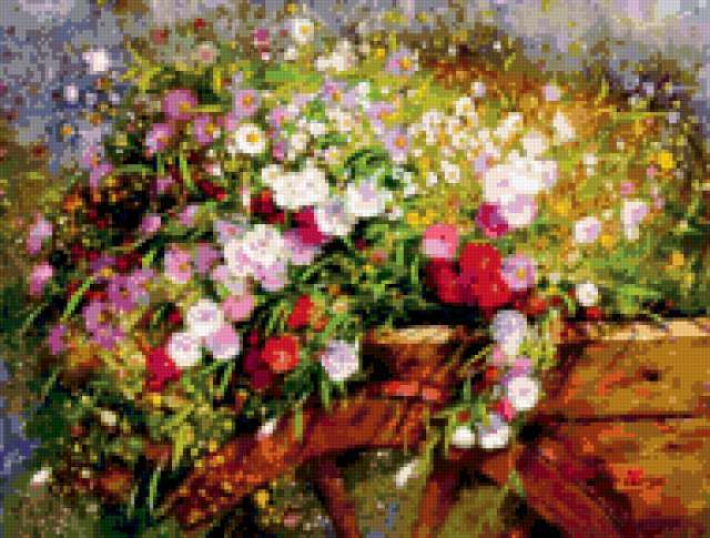 Ориентировочно так, схема вышивки «&6359», созданная автором Axlamonka, будет выглядеть при отшиве на канве. Размер данной вышивки равен 190x144 крестов, при этом используется 85 цветов. Ключевые слова, по которым можно найти эту схему: цветы, букет, натюрморт, картина. Также, вы можете взглянуть на оригинальную картинку, соответствующую данной схеме вышивки.