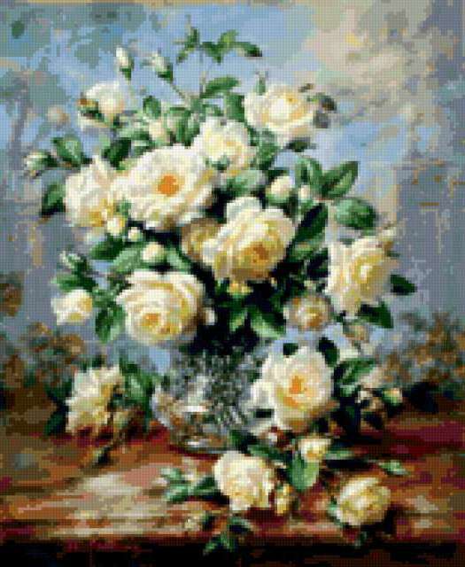Ориентировочно так, схема вышивки «&6363», созданная автором Axlamonka, будет выглядеть при отшиве на канве. Размер данной вышивки равен 156x190 крестов, при этом используется 69 цветов. Ключевые слова, по которым можно найти эту схему: цветы, букет, натюрморт, розы. Также, вы можете взглянуть на оригинальную картинку, соответствующую данной схеме вышивки.