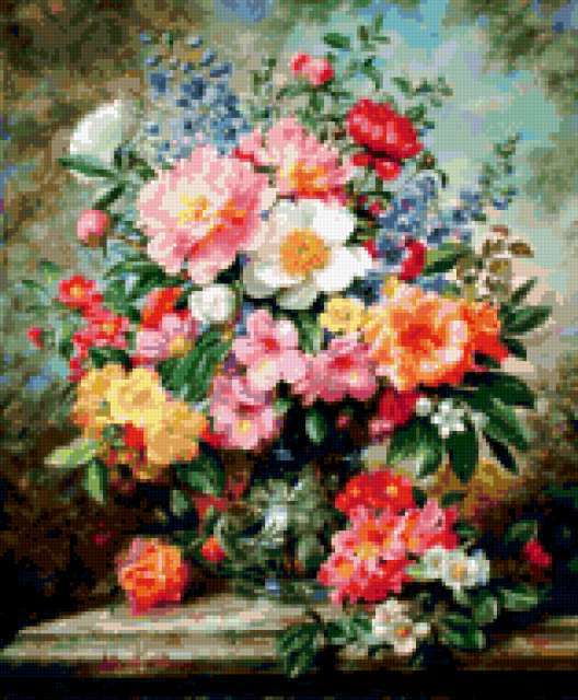 Ориентировочно так, схема вышивки «&6366», созданная автором Axlamonka, будет выглядеть при отшиве на канве. Размер данной вышивки равен 157x190 крестов, при этом используется 77 цветов. Ключевые слова, по которым можно найти эту схему: цветы, букет, натюрморт, картина. Также, вы можете взглянуть на оригинальную картинку, соответствующую данной схеме вышивки.