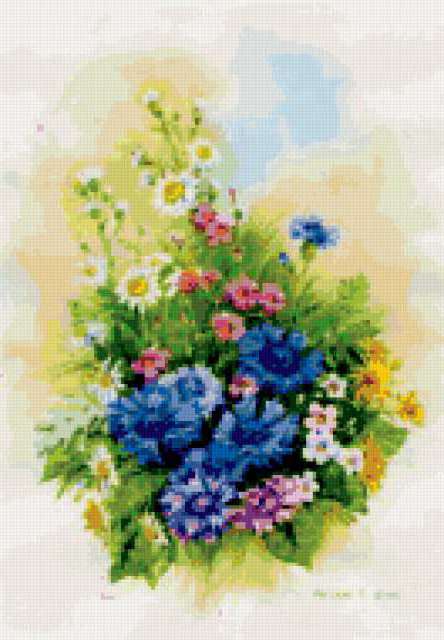 Ориентировочно так, схема вышивки «&6373», созданная автором Axlamonka, будет выглядеть при отшиве на канве. Размер данной вышивки равен 132x190 крестов, при этом используется 52 цветов. Ключевые слова, по которым можно найти эту схему: цветы, букет, картина. Также, вы можете взглянуть на оригинальную картинку, соответствующую данной схеме вышивки.