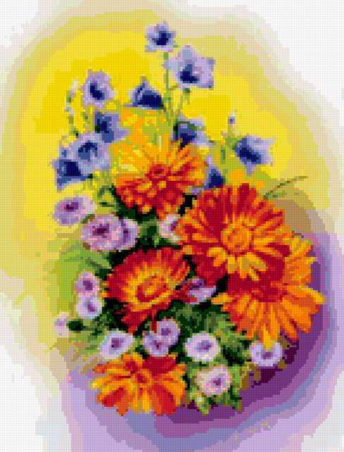 Ориентировочно так, схема вышивки «&6381», созданная автором Axlamonka, будет выглядеть при отшиве на канве. Размер данной вышивки равен 145x190 крестов, при этом используется 60 цветов. Ключевые слова, по которым можно найти эту схему: цветы, букет, картина, ноготки, колокольчики, маргаритки. Также, вы можете взглянуть на оригинальную картинку, соответствующую данной схеме вышивки.