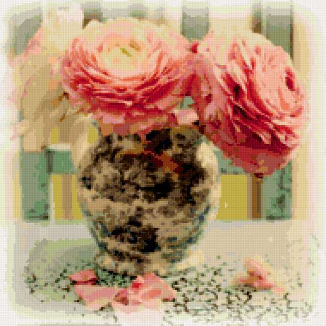 Ориентировочно так, схема вышивки «&6383», созданная автором Axlamonka, будет выглядеть при отшиве на канве. Размер данной вышивки равен 190x190 крестов, при этом используется 66 цветов. Ключевые слова, по которым можно найти эту схему: цветы, букет, натюрморт, розы. Также, вы можете взглянуть на оригинальную картинку, соответствующую данной схеме вышивки.