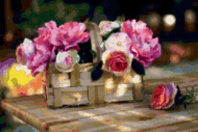 Ориентировочно так, схема вышивки «&6385», созданная автором Axlamonka, будет выглядеть при отшиве на канве. Размер данной вышивки равен 190x127 крестов, при этом используется 70 цветов. Ключевые слова, по которым можно найти эту схему: цветы, букет, натюрморт, розы. Также, вы можете взглянуть на оригинальную картинку, соответствующую данной схеме вышивки.