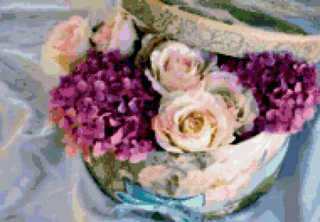 Ориентировочно так, схема вышивки «&6386», созданная автором Axlamonka, будет выглядеть при отшиве на канве. Размер данной вышивки равен 190x132 крестов, при этом используется 70 цветов. Ключевые слова, по которым можно найти эту схему: цветы, букет, натюрморт, розы, гортензия. Также, вы можете взглянуть на оригинальную картинку, соответствующую данной схеме вышивки.