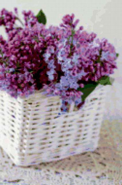 Ориентировочно так, схема вышивки «&6388», созданная автором Axlamonka, будет выглядеть при отшиве на канве. Размер данной вышивки равен 126x190 крестов, при этом используется 58 цветов. Ключевые слова, по которым можно найти эту схему: цветы, букет, натюрморт, сирень, корзинка. Также, вы можете взглянуть на оригинальную картинку, соответствующую данной схеме вышивки.