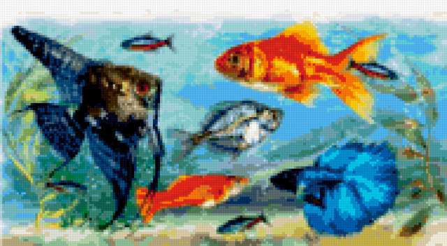 Ориентировочно так, схема вышивки «&6389», созданная автором Axlamonka, будет выглядеть при отшиве на канве. Размер данной вышивки равен 190x105 крестов, при этом используется 68 цветов. Ключевые слова, по которым можно найти эту схему: рыбки. Также, вы можете взглянуть на оригинальную картинку, соответствующую данной схеме вышивки.