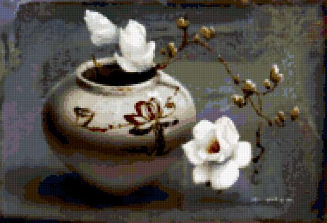 Ориентировочно так, схема вышивки «&6394», созданная автором Axlamonka, будет выглядеть при отшиве на канве. Размер данной вышивки равен 190x130 крестов, при этом используется 46 цветов. Ключевые слова, по которым можно найти эту схему: цветок, магнолия, натюрморт. Также, вы можете взглянуть на оригинальную картинку, соответствующую данной схеме вышивки.