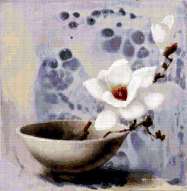 Ориентировочно так, схема вышивки «&6398», созданная автором Axlamonka, будет выглядеть при отшиве на канве. Размер данной вышивки равен 187x190 крестов, при этом используется 52 цветов. Ключевые слова, по которым можно найти эту схему: цветок, магнолия, натюрморт, подушка. Также, вы можете взглянуть на оригинальную картинку, соответствующую данной схеме вышивки.