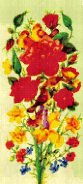 Ориентировочно так, схема вышивки «&6400», созданная автором Axlamonka, будет выглядеть при отшиве на канве. Размер данной вышивки равен 86x190 крестов, при этом используется 56 цветов. Ключевые слова, по которым можно найти эту схему: картина, цветы, птички. Также, вы можете взглянуть на оригинальную картинку, соответствующую данной схеме вышивки.
