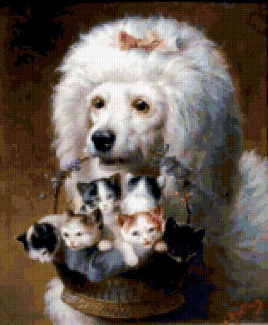 Ориентировочно так, схема вышивки «&6406», созданная автором Axlamonka, будет выглядеть при отшиве на канве. Размер данной вышивки равен 157x190 крестов, при этом используется 65 цветов. Ключевые слова, по которым можно найти эту схему: собака, пудель, корзина, котята. Также, вы можете взглянуть на оригинальную картинку, соответствующую данной схеме вышивки.