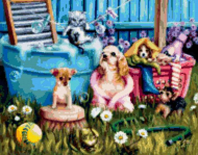 Ориентировочно так, схема вышивки «&6409», созданная автором Axlamonka, будет выглядеть при отшиве на канве. Размер данной вышивки равен 190x149 крестов, при этом используется 82 цветов. Ключевые слова, по которым можно найти эту схему: щеночки, котята, лето, лужайка, купание. Также, вы можете взглянуть на оригинальную картинку, соответствующую данной схеме вышивки.