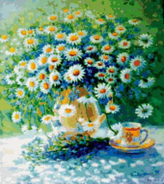 Ориентировочно так, схема вышивки «&6426», созданная автором Axlamonka, будет выглядеть при отшиве на канве. Размер данной вышивки равен 170x190 крестов, при этом используется 61 цветов. Ключевые слова, по которым можно найти эту схему: букет, натюрморт, ромашки, утро. Также, вы можете взглянуть на оригинальную картинку, соответствующую данной схеме вышивки.